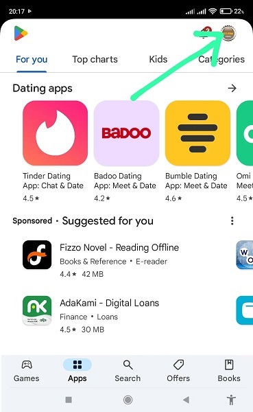 - Setelah halaman Play Store terbuka, klik logo email ( google account ) yang terdapat pada pojok kanan atas (perhatikan gambar diatas) .
