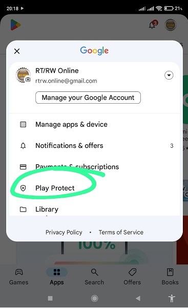- Perhatikan pada halaman Play Protect Setting ada 2 (dua) pilihan On/Off, silahkan geser ke mode OFF untuk pilihan bagian atas ( lihat lingkaran hijau pada gambar diatas).